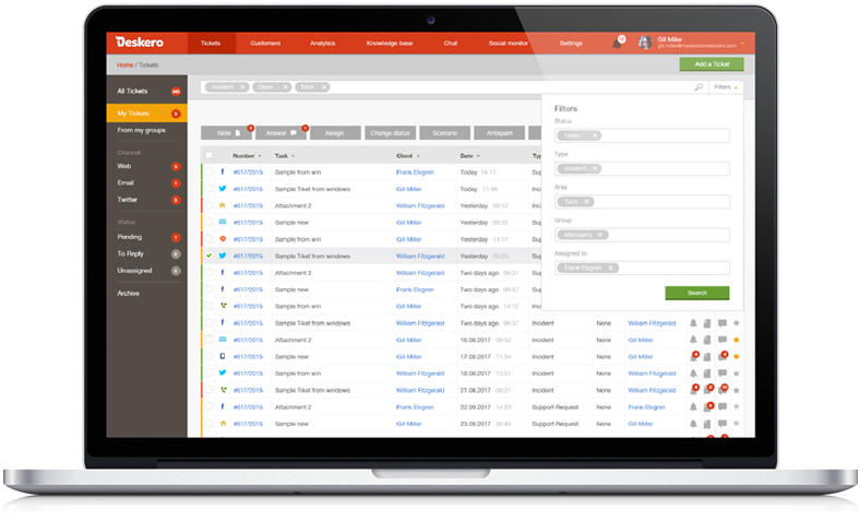 Olvídese del alboroto de correos electrónicos, de páginas sociales que siempre se abren en su navegador y de los post-its: con Deskero, todas las solicitudes de sus clientes estarán listas en una plataforma unificada, para un rendimiento optimizado.